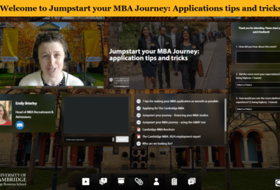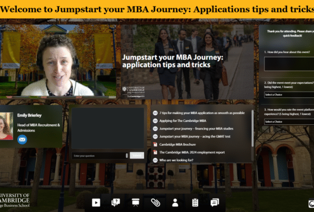 The marketing and events team at the University of Cambridge Judge Business School are focused on attracting high-performing professionals to their Cambridge MBA program. The team has long used in-person events to recruit and educate prospective students. However, during the time when in-person events were not possible, they needed to pivot and find a way to engage with professionals, at the same time that people were starting to experience Zoom fatigue.