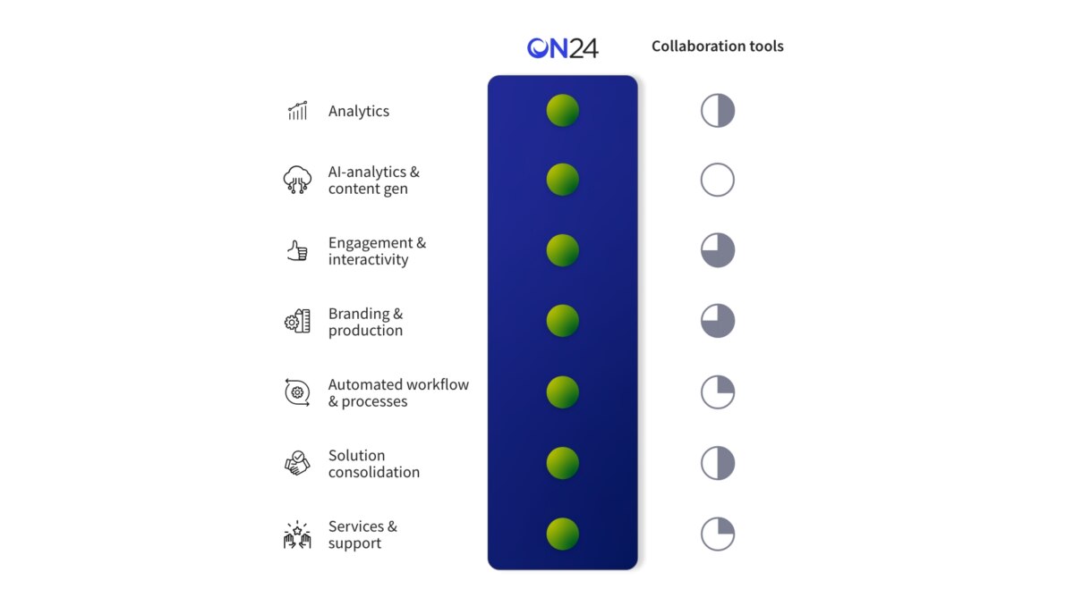 With ON24, you can give your customers and prospects a next-generation experience that stands out from the competition, with interactive audience participation, custom branding and calls-to-actions personalized for different audience segments within the same webinar.